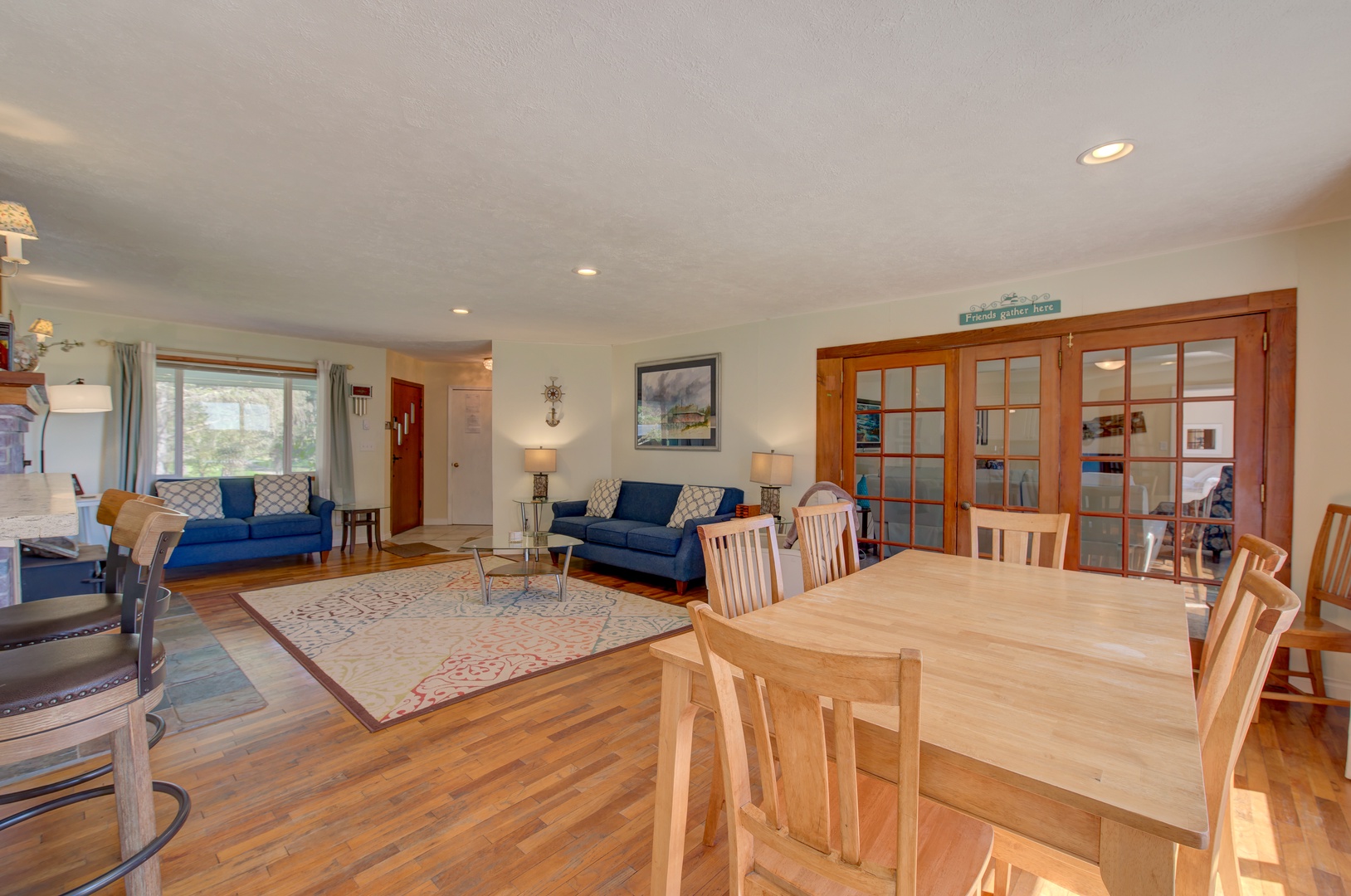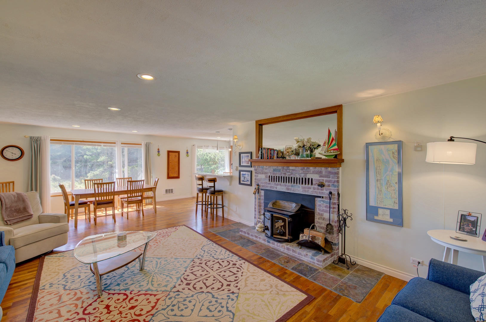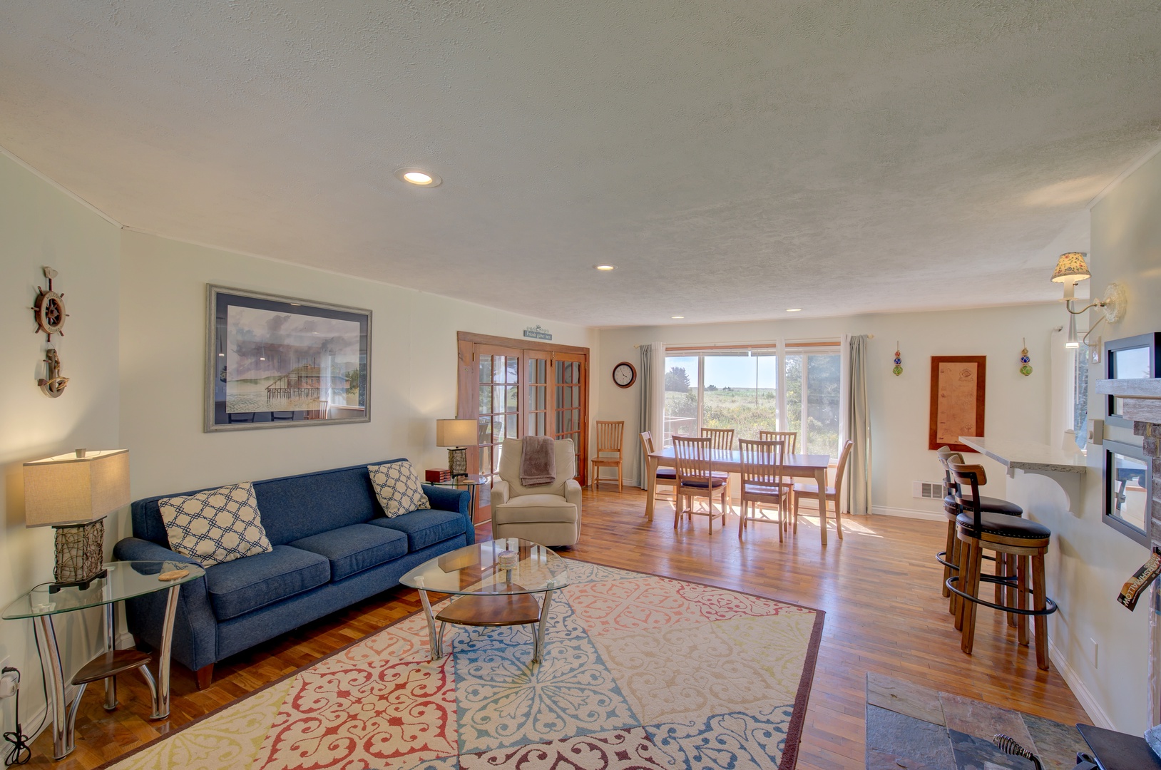 Beach Retreat has room enough for up to 10 people maximum and is pet friendly with an extra charge. The downstairs master bedroom has a king bed, master bath and its own sliding glass door out to the large lower deck. There are two more full baths to service the remaining three downstairs bedrooms. All the bedrooms have been remodeled for a luxurious feel. The living room/dining room offers hardwood floors and an open floor plan with a wood burning fireplace [GUESTS PROVIDE THEIR OWN FIREWOOD].
