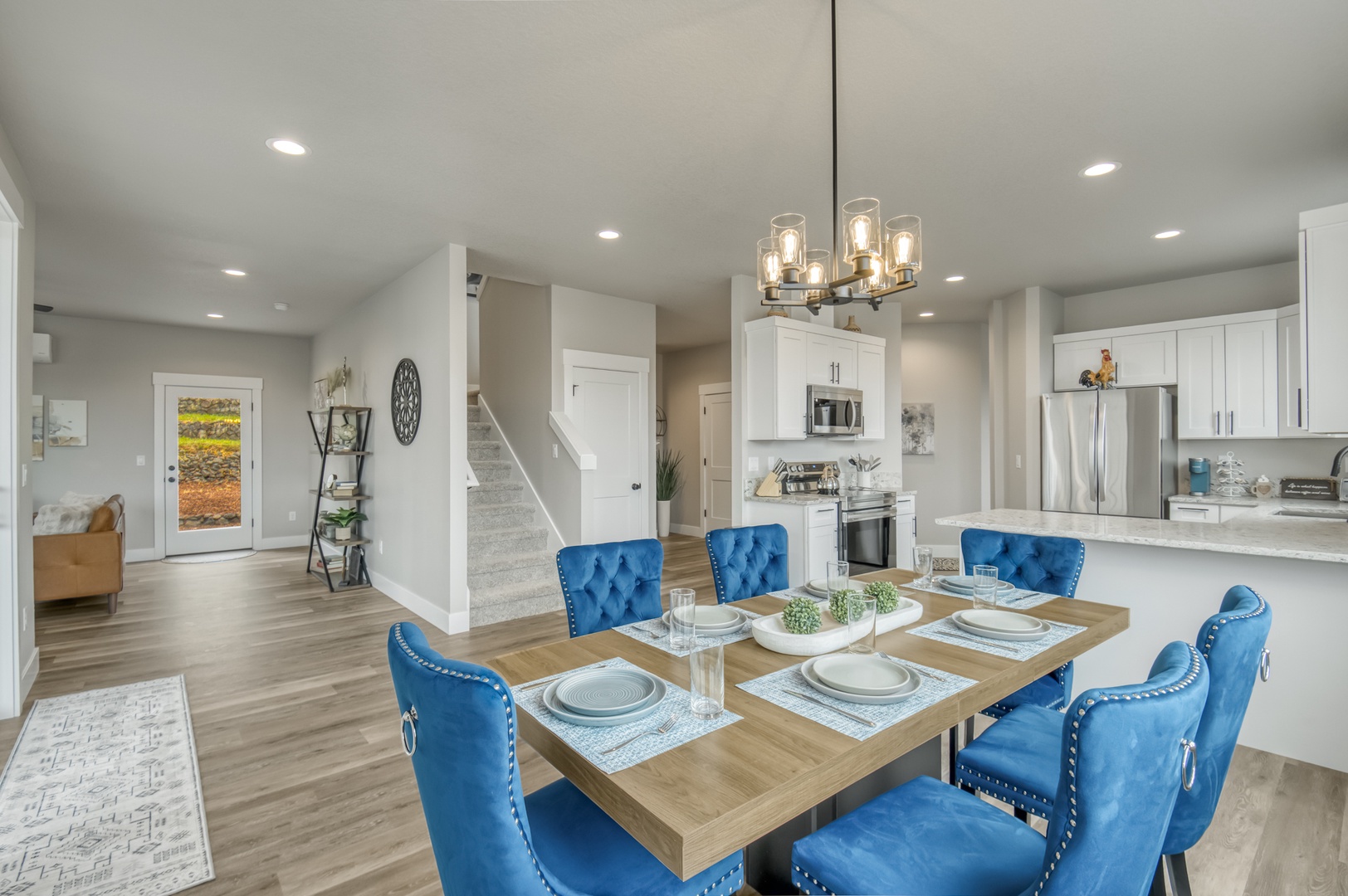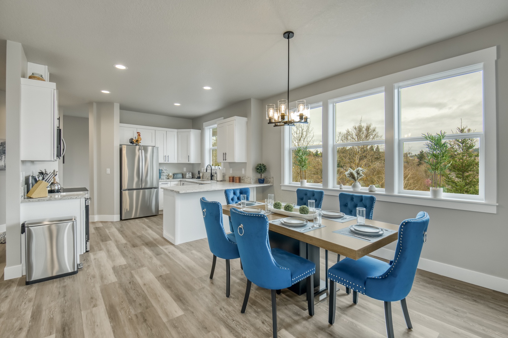 Modern kitchen flows seamlessly into the dining space, where quartz countertops and stainless steel appliances make cooking a joy.