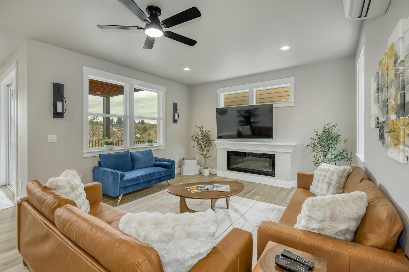 Down stairs living room with smart TV on swivel mount. Electric fire place.